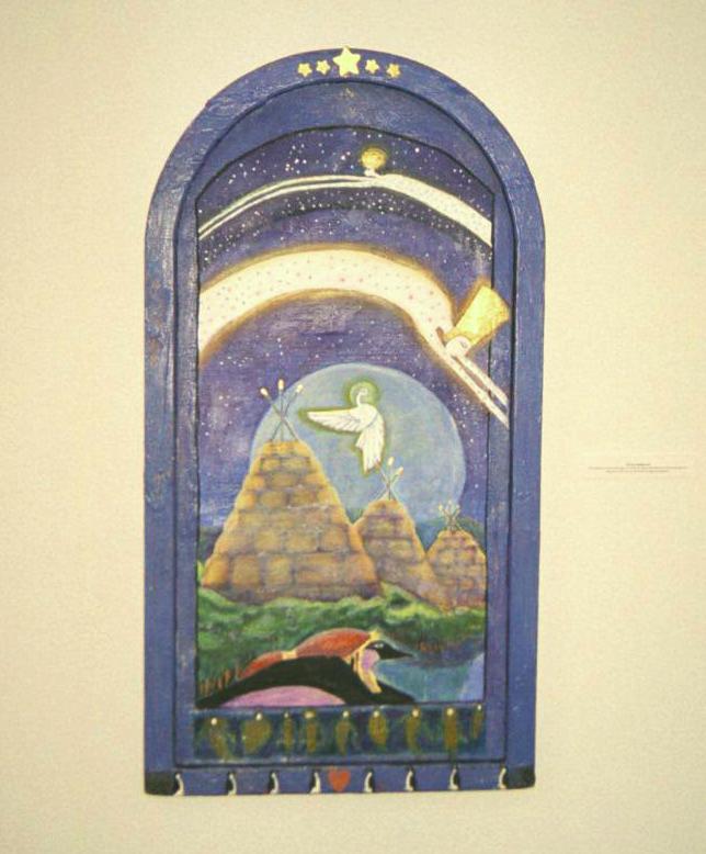This is the head board that hung behind the throne. It pictures the Twins of night and day. It also shows the Great Stone Tee-Pees of the Sachem Cheops, as well as the giant figure of Peng-Ra at the entrances.
